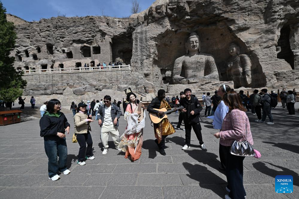 Tourists visit Yungang Grottoes in Datong, north China's Shanxi Province, April 15, 2025. (Xinhua/Zhan Yan)