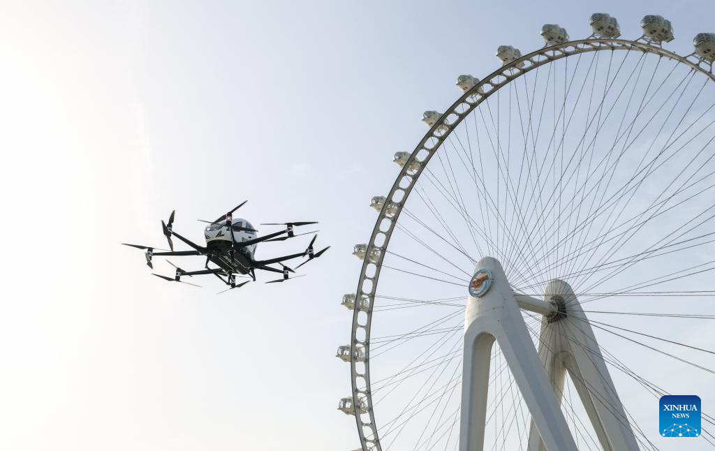 An electric vertical takeoff and landing (eVTOL) aircraft, developed by Chinese drone maker EHang, carries out a demo flight at the urban air traffic operation demonstration center in Bao'an District in Shenzhen, south China's Guangdong Province, April 16, 2025. (Xinhua/Mao Siqian)