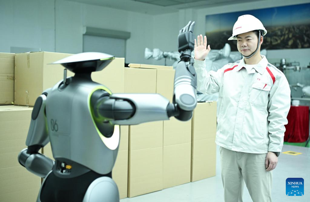 A technical staff member interacts with GoMate, a humanoid robot, at GAC R&D Center in Guangzhou, south China's Guangdong Province, March 18, 2025. (Xinhua/Deng Hua)