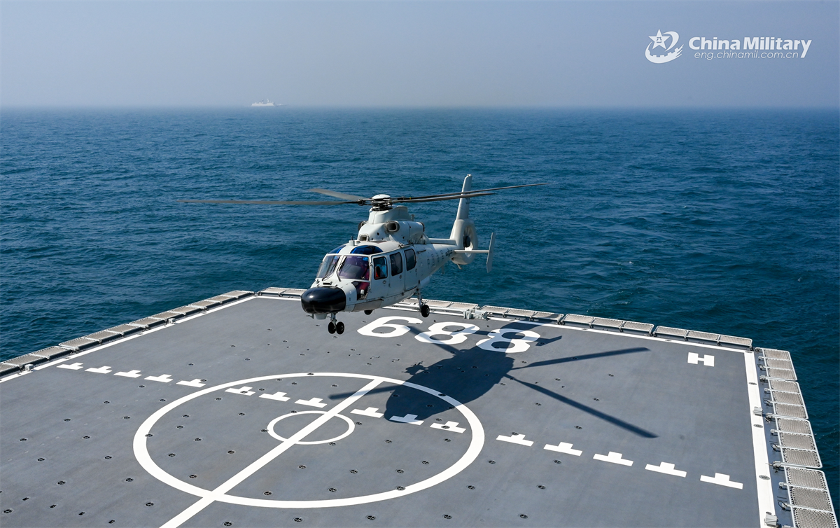 A Z-9 helicopter attached to a combat support ship flotilla with the navy under the Chinese PLA Northern Theater Command lands on the comprehensive supply ship Taihu (Hull 889) during a maritime training exercise in early April, 2025. (eng.chinamil.com.cn/Photo by Zhou Yuanzhi)
