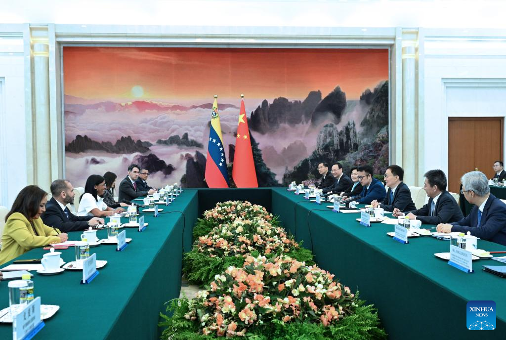 Chinese Vice President Han Zheng meets with Venezuelan Vice President Delcy Rodriguez in Beijing, capital of China, April 24, 2025. (Xinhua/Rao Aimin)