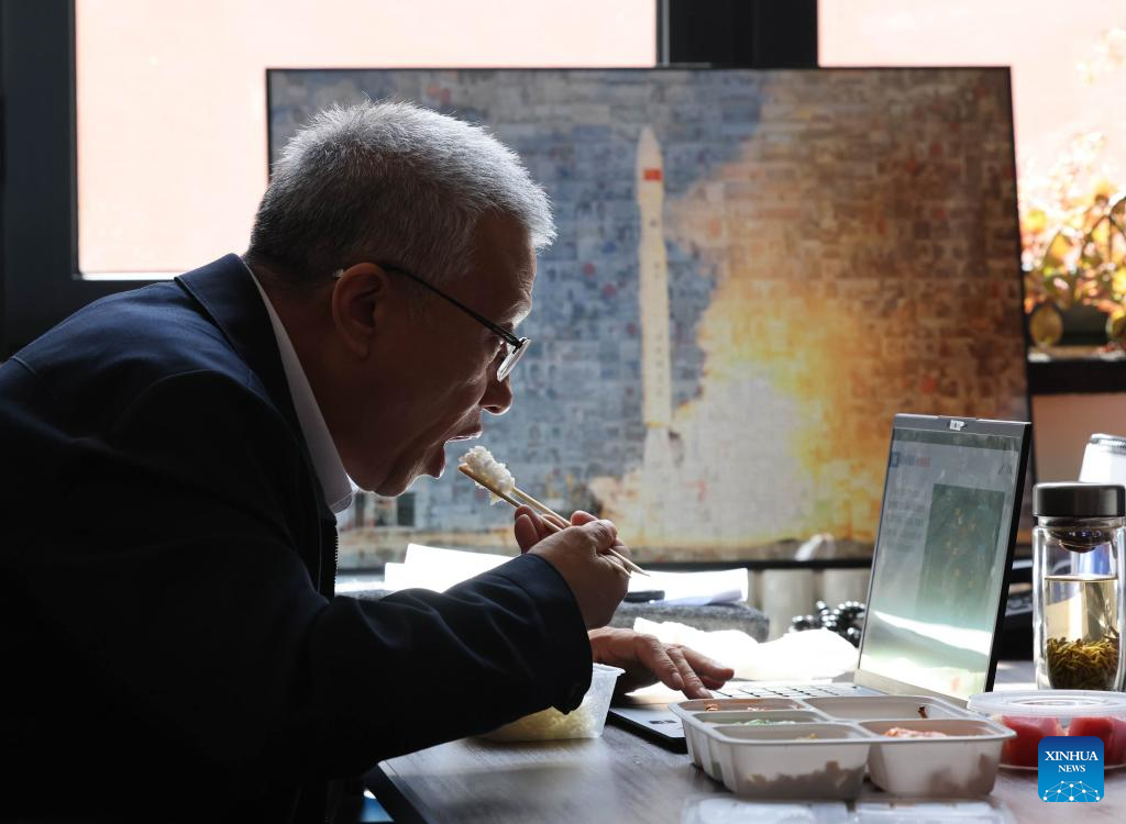 Yang Yiqiang has a box meal after a meeting at the Institute of Mechanics, Chinese Academy of Sciences, in Beijing, capital of China, April 17, 2025. Yang Yiqiang once served as former commander-in-chief of the Long March-11 rocket project. In December 2018, he founded CAS Space, a company focusing on rocket development and space launch services. CAS Space's Lijian-1 carrier rockets have already completed multiple launches, supporting remote sensing and experimental satellites. The upcoming Lijian-2 rocket will be capable of supporting satellite internet networking technology and cargo transport missions for the China's Space Station. (Xinhua/Yin Gang)
