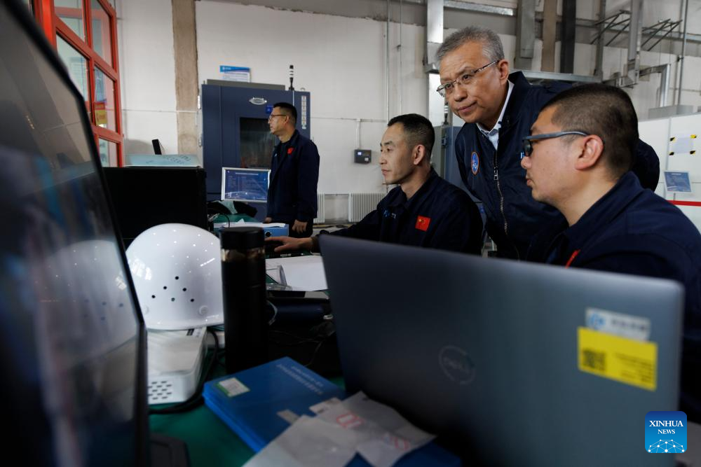 Yang Yiqiang (2nd, R), along with the staff, monitors the progress of the vibration test at the CAS Space's experimental center in Beijing, capital of China, April 19, 2025. Yang Yiqiang once served as former commander-in-chief of the Long March-11 rocket project. In December 2018, he founded CAS Space, a company focusing on rocket development and space launch services. CAS Space's Lijian-1 carrier rockets have already completed multiple launches, supporting remote sensing and experimental satellites. The upcoming Lijian-2 rocket will be capable of supporting satellite internet networking technology and cargo transport missions for the China's Space Station. (Xinhua/Jin Liwang)