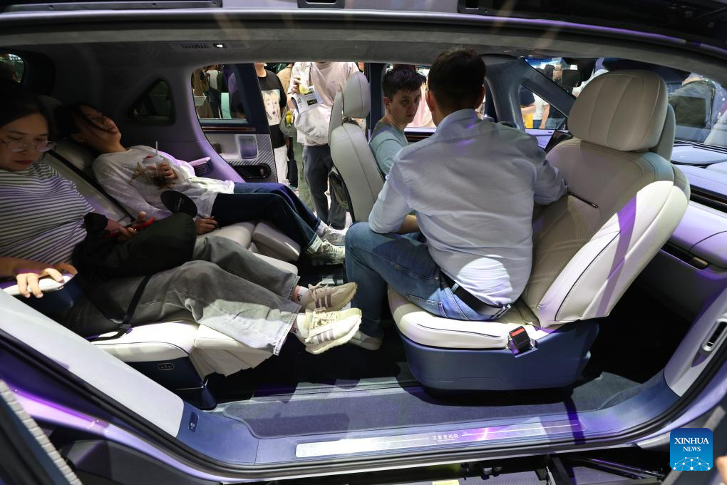 Visitors sit in an Xpeng G6 on display at the 21st Shanghai International Automobile Industry Exhibition in east China's Shanghai, April 26, 2025. The exhibition, also known as Auto Shanghai 2025, not only foreshadows technological trends in the global auto market, but also demonstrates the strength and confidence of China's rising automakers in the face of established global giants. (Xinhua/Fang Zhe)