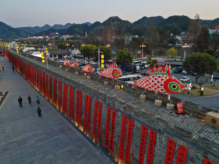 This photo taken on March 19, 2025 shows fish-shaped lanterns on the ancient walls of Huizhou ancient town in Shexian County, east China's Anhui Province. (Xinhua/Guo Chen)