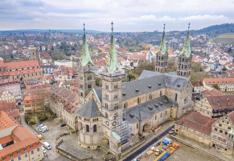 An aerial drone photo taken on March 24, 2025 shows a view of the Bamberger Dom in the ancient town of Bamberg in Bavarian state, Germany. (Xinhua/Ma Zhiyi)