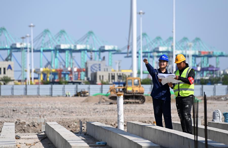 Workers work at the construction site of a vehicle logistics yard of the international ro-ro terminal of Tianjin Port in north China's Tianjin, April 25, 2025. (Xinhua/Zhao Zishuo)