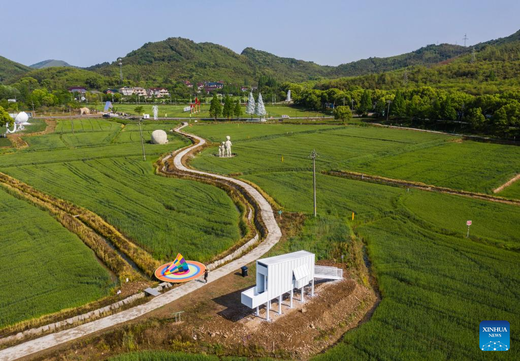 This photo taken on April 25, 2025 shows art works displayed in the fields in Donglin Town, Huzhou City of east China's Zhejiang Province. A land art event kicked off in the wheat fields in Donglin Town on Friday. Teachers and students from many Chinese fine arts academies formed the core creative team, producing 42 land art pieces here.