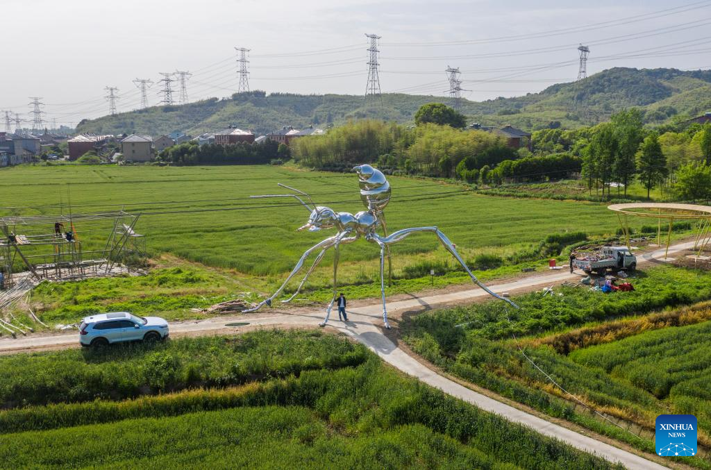 Villagers walk past an exhibited art work in the fields in Donglin Town, Huzhou City of east China's Zhejiang Province, on April 25, 2025. A land art event kicked off in the wheat fields in Donglin Town on Friday. Teachers and students from many Chinese fine arts academies formed the core creative team, producing 42 land art pieces here.