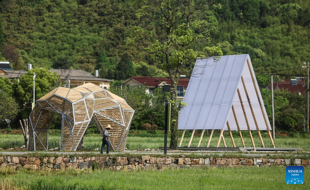 Taking the vast land as canvas and natural elements as medium, the artists skillfully integrated various art forms such as art installation and landscape art into the fields and villages, allowing tourists and local people to enjoy the art works in the countryside. (Xinhua/Xu Yu)