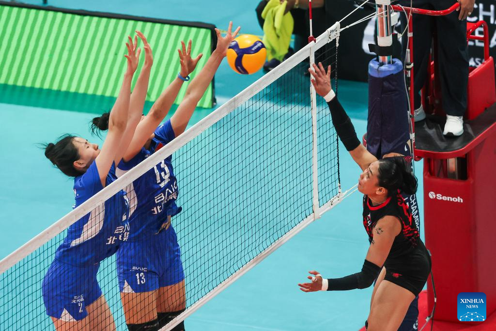 Lu Yufei (L) of China's BAIC Motor Volleyball Club competes during the quarterfinal match between China's BAIC Motor Volleyball Club and the Philippines' Petro Gazz Angels at the AVC Women's Volleyball Champions League in Pasig City, the Philippines, April 25, 2025. (Photo by ROUELLE UMALI/Xinhua)