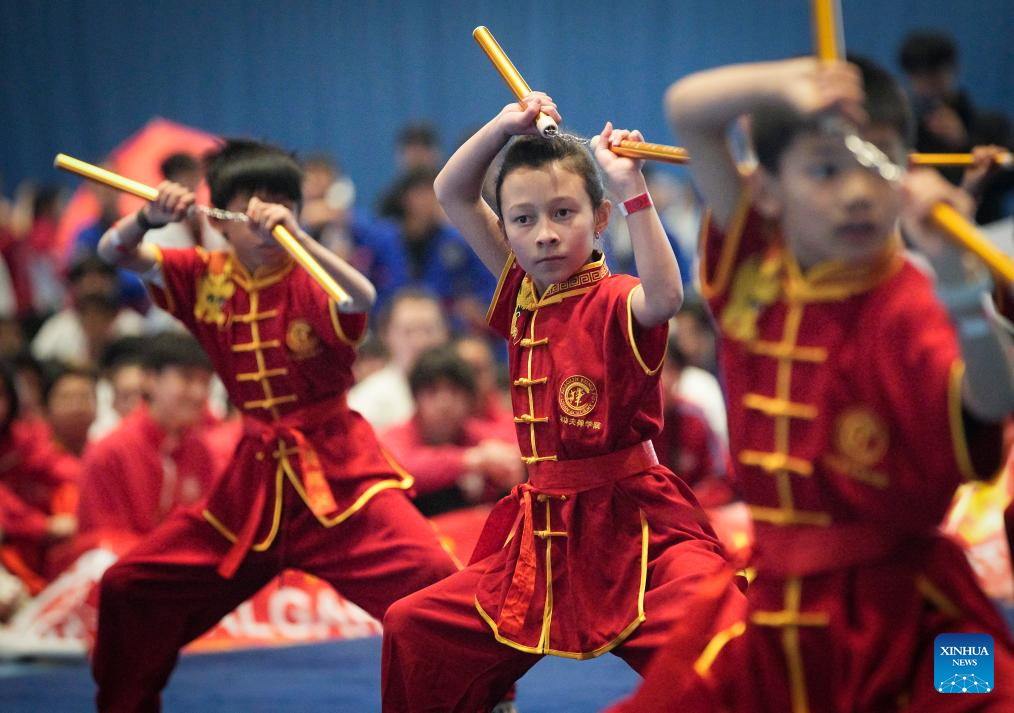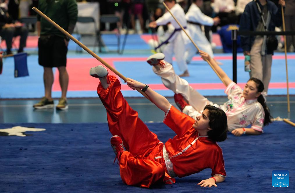 Young contestants compete in the Wushu division during the 2025 Can-Am Martial Arts Championships in Richmond, British Columbia, Canada, April 26, 2025. (Photo by Liang Sen/Xinhua)