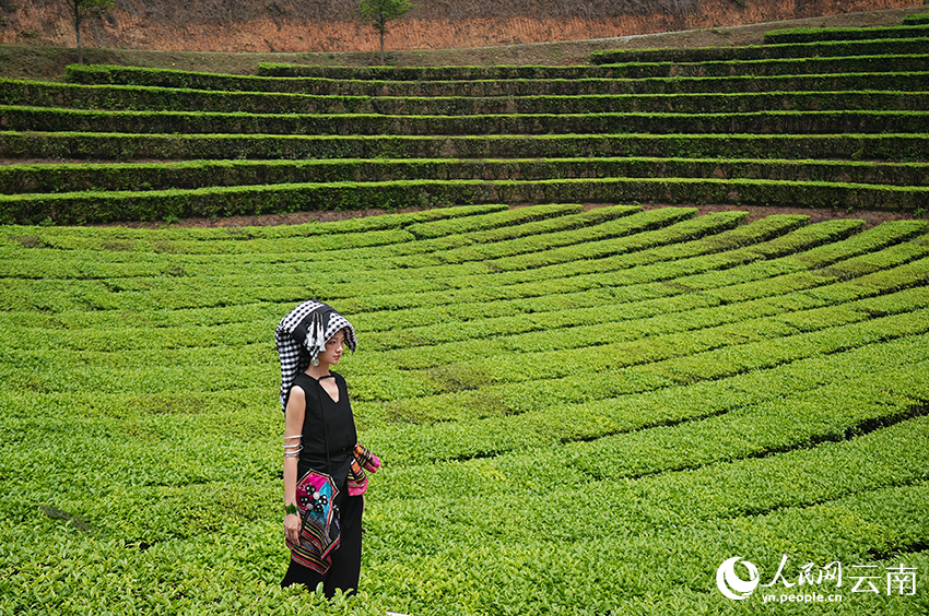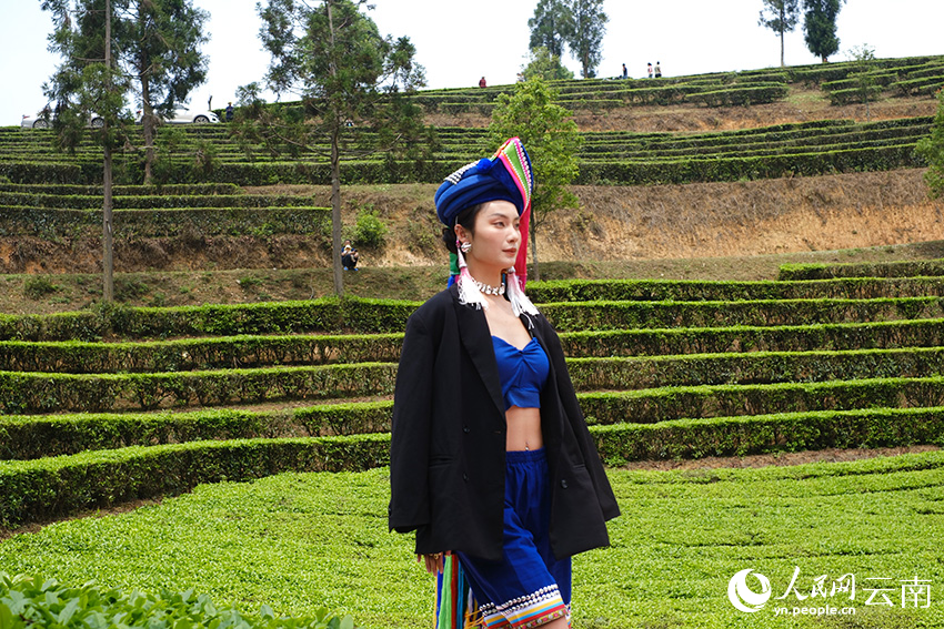 A model showcase ethnic dress in a tea garden in Mengsa town, Gengma Dai and Wa Autonomous County, Lincang city, southwest China's Yunnan Province. (People's Daily Online/Zeng Zhihui)
