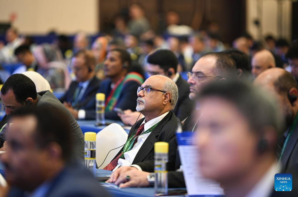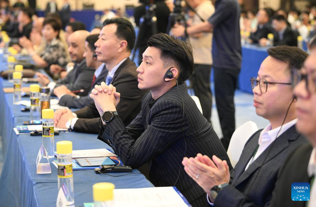 This photo taken on April 28, 2025 shows a panel discussion of the 11th China-Arab Business Conference and the 9th Investment Seminar of the China-Arab States Cooperation Forum in Haikou, south China's Hainan Province. The conference was co-hosted by the China Council for the Promotion of International Trade, the People's Government of Hainan Province, the Secretariat of the Arab League, and the General Union of Chambers of Commerce, Industry & Agriculture of the Arab Countries. More than 1,000 representatives from domestic and international political and business circles attended the event. (Xinhua/Pu Xiaoxu)