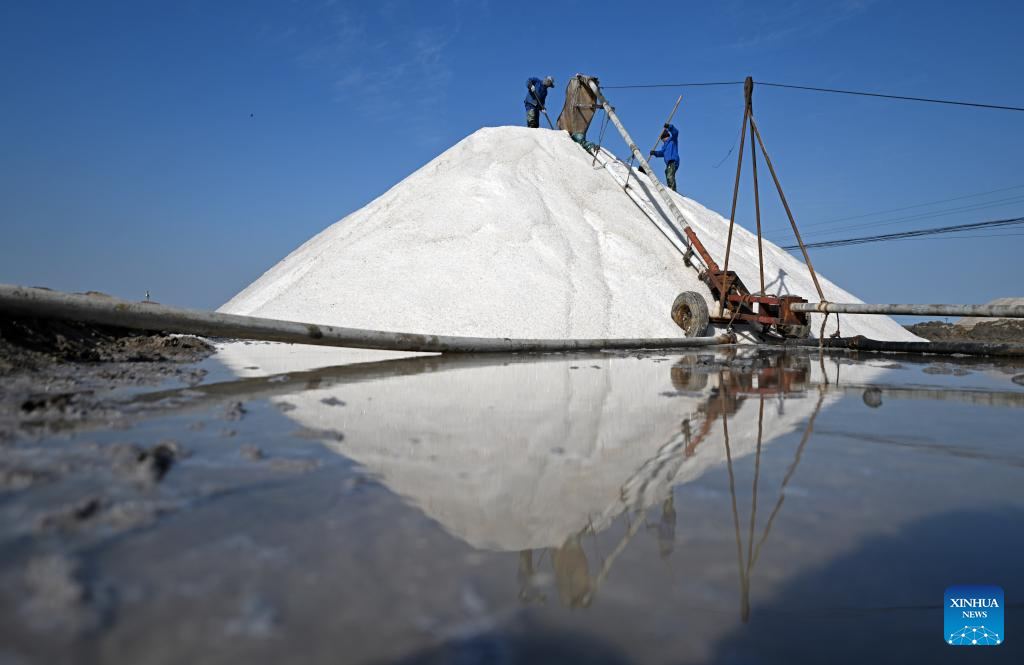 In recent days, workers of Tianjin Changlu Haijing Group Co., Ltd. have been busy harvesting salt in its 250,000 mu (about 16,700 hectares) of salt flats. The spring harvest of salt usually starts from mid-to-late March to June, depending on the weather condition. (Xinhua/Zhao Zishuo)