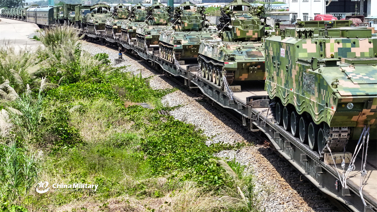 Armored vehicles attached to an air-defense unit with a brigade under the Chinese PLA 73rd Group Army are loaded onto the rail flat cars during a rail-load training exercise aiming to enhance the troops' long-distance transportation capability on April 23, 2025. (eng.chinamil.com.cn/Photo by Liu Zhiyong)