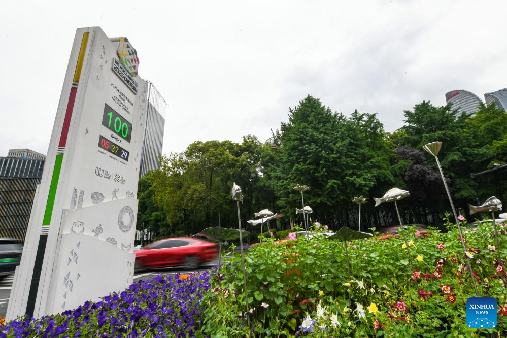 This photo taken on April 29, 2025 shows a countdown clock marking 100 days to go for the World Games 2025 in Chengdu, southwest China's Sichuan Province. The Games will be held in Chengdu from Aug. 7 to 17. (Xinhua/Wang Xi)