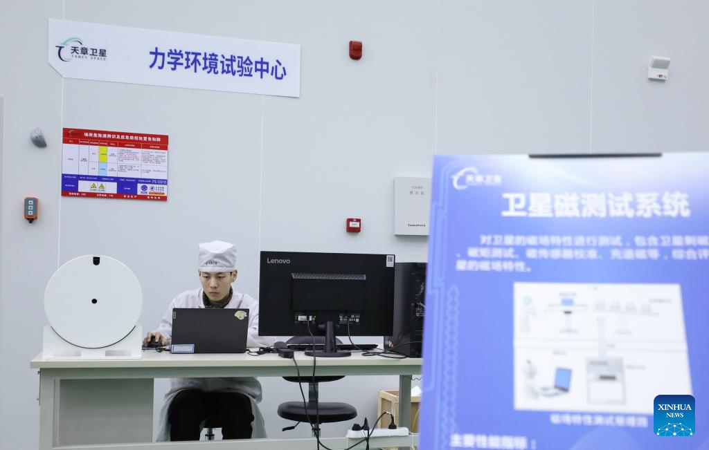 An employee checks the assembly of a satellite at a satellite manufacturing base in Hebi, central China's Henan Province, April 21, 2025. (Xinhua/Li Jianan)
