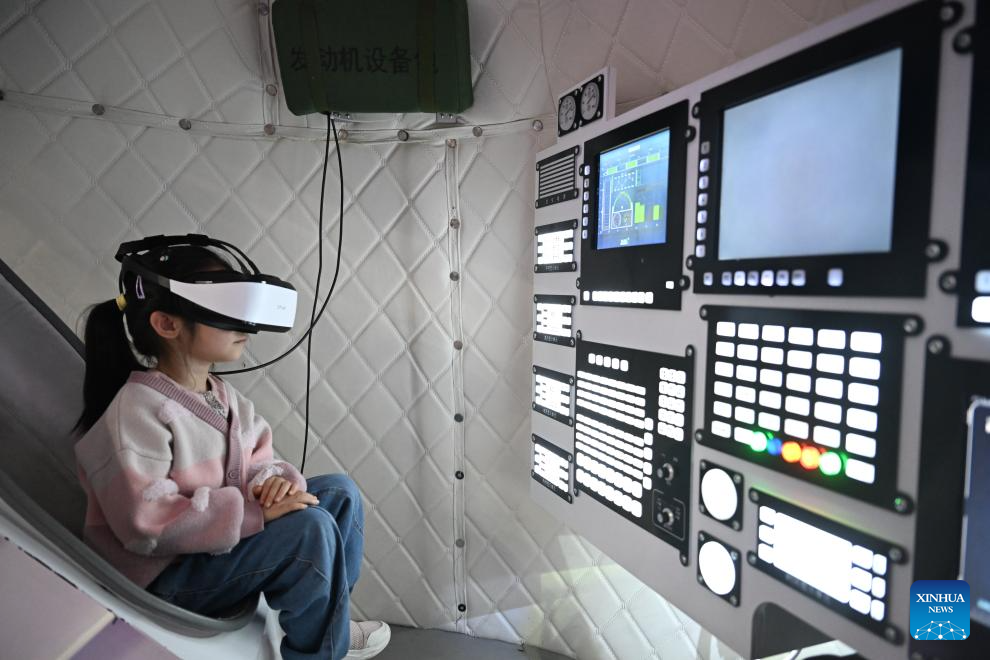 A kid tries a Mars rover module under the guidance of a docent at an aerospace science popularization base in a satellite manufacturing industrial park in Hebi, central China's Henan Province, April 21, 2025. (Xinhua/Du Xiaoyi)