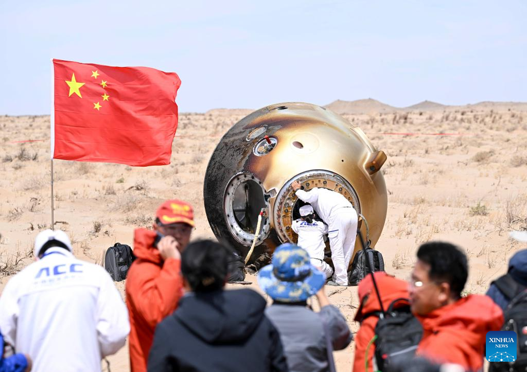 JIUQUAN, April 30 (Xinhua) -- The return capsule of the Shenzhou-19 crewed spaceship, carrying astronauts Cai Xuzhe, Song Lingdong and Wang Haoze, touched down at the Dongfeng landing site in north China's Inner Mongolia Autonomous Region on Wednesday.