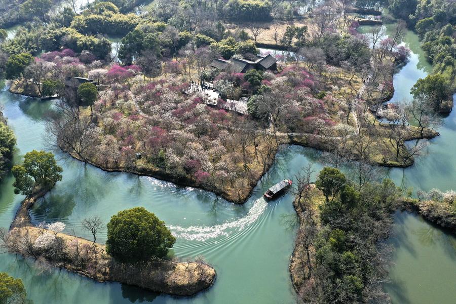 An aerial drone photo taken on Feb. 18, 2025 shows a sightseeing boat at the Xixi National Wetland Park in Hangzhou, east China's Zhejiang Province. (Xinhua/Huang Zongzhi)