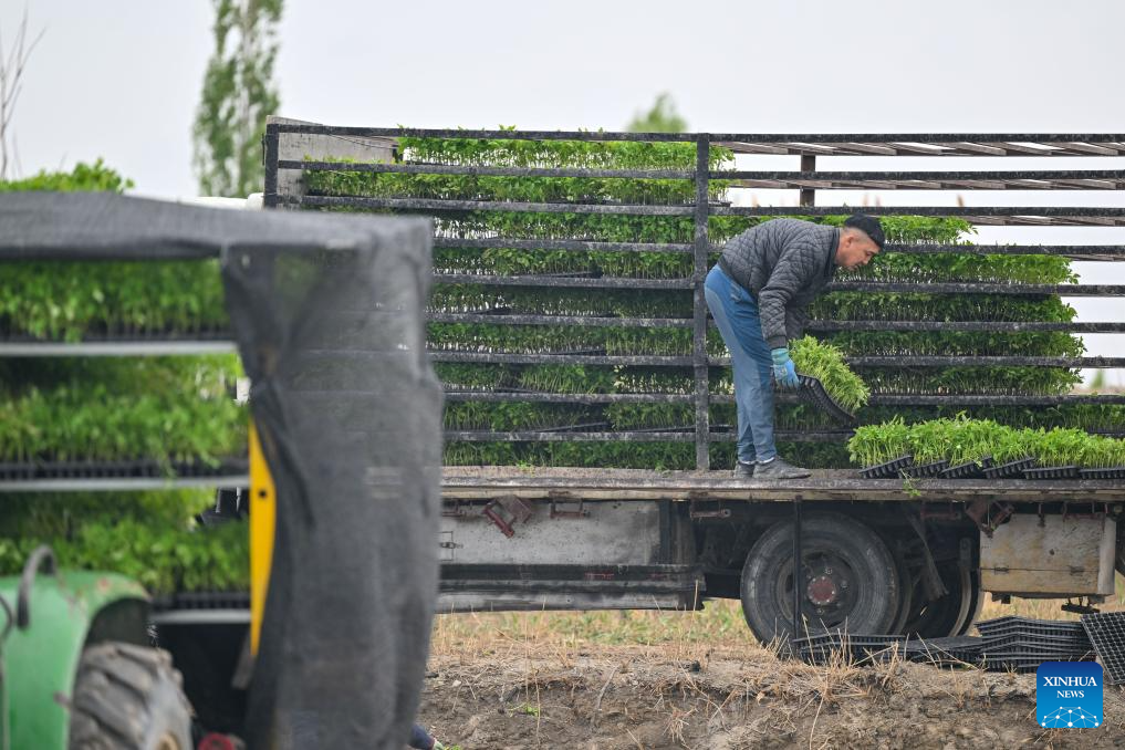 A farmer carries tomato seedlings in a field in Hui Autonomous County of Yanqi, Mongolian Autonomous Prefecture of Bayingolin in northwest China's Xinjiang Uygur Autonomous Region, April 26, 2025. The application of mechanized, intelligent and automated equipment improves the efficiency of local tomato and red pepper planting. (Xinhua/Ding Lei)