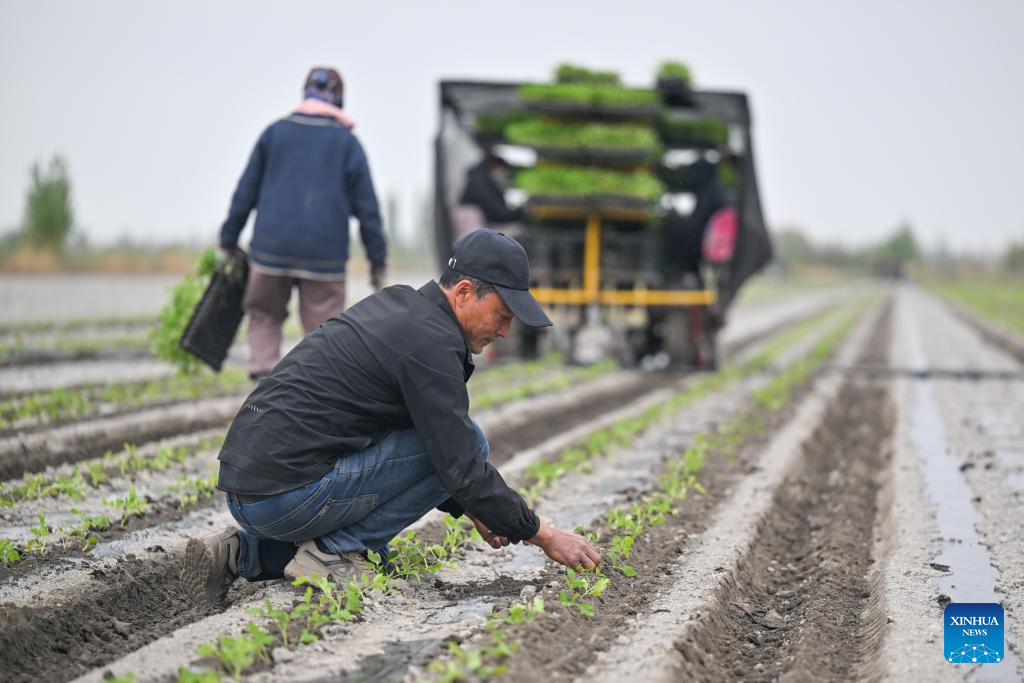 Farmers transplant tomato seedlings in a field in Hui Autonomous County of Yanqi, Mongolian Autonomous Prefecture of Bayingolin in northwest China's Xinjiang Uygur Autonomous Region, April 26, 2025. The application of mechanized, intelligent and automated equipment improves the efficiency of local tomato and red pepper planting. (Xinhua/Ding Lei)