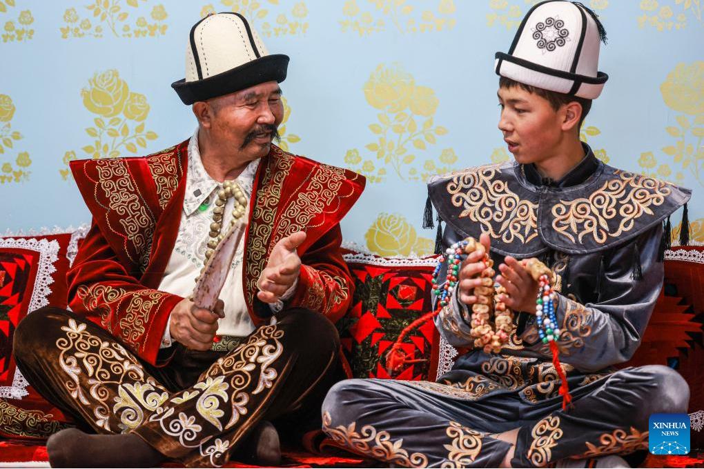 Jannur Turganbay (L), a representative inheritor of the "Manas" epic, explains the history of "Manas" to his apprentice at his home in Artux City, Kizilsu Kirgiz Autonomous Prefecture in northwest China's Xinjiang Uygur Autonomous Region, April 21, 2025. (Xinhua/Wang Fei)
