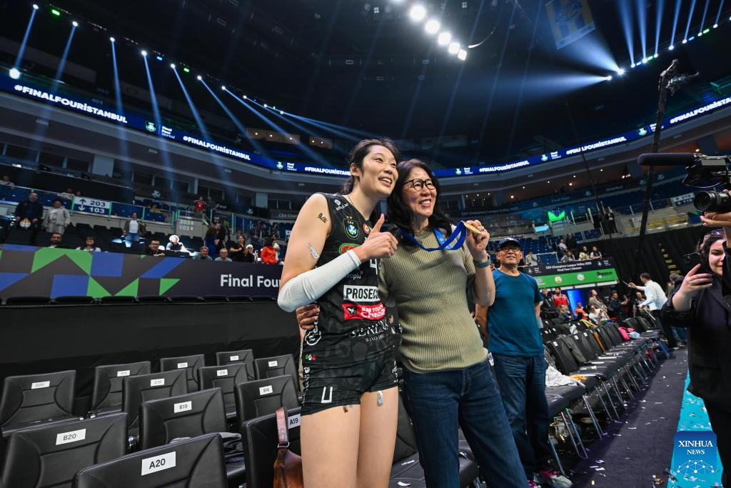 Zhu Ting (L) of Carraro Imoco Conegliano poses with China's legendary volleyball coach Lang Ping after the women's final between Carraro Imoco Conegliano of Italy and Savino Del Bene Scandicci of Italy at CEV Champions League Volley 2025 in Istanbul, Trkiye, May 4, 2025. (Xinhua/Liu Lei)