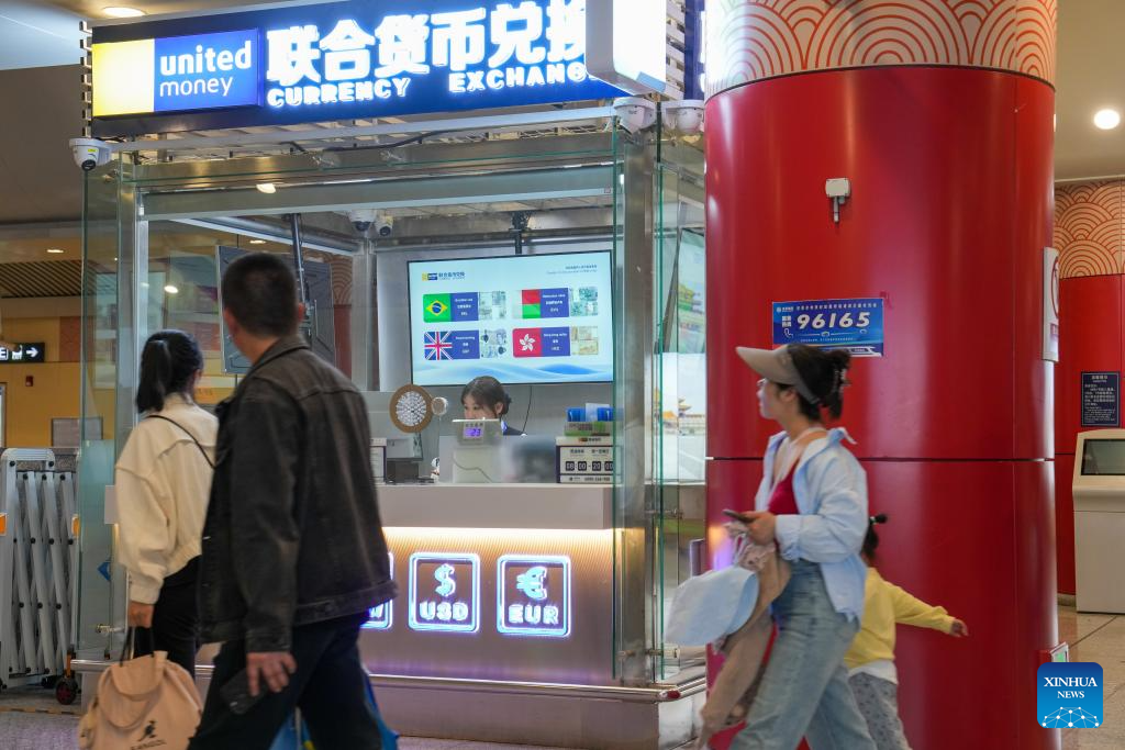 People walk past the Currency Exchange in Wangfujing station of Beijing Subway Line 8 in Beijing, capital of China, April 28, 2025. (Xinhua/Ju Huanzong)