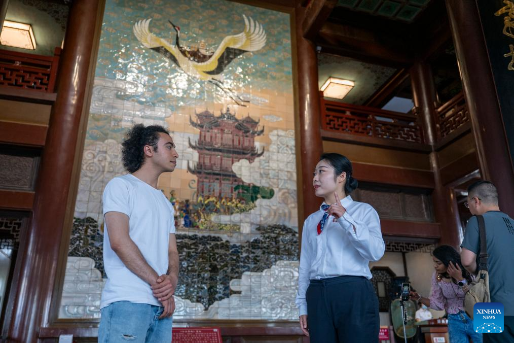 Docent Hu Yanan (R, front) provides English service for Egyptian tourist Khaled Metwally Abdelhay Mohamed (L, front) at the Yellow Crane Tower, or Huanghelou, a landmark in Wuhan, central China's Hubei Province, April 30, 2025. (Xinhua/Wu Zhizun)
