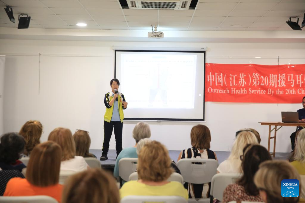 Tang Limei, a member of the 20th Chinese medical team for Malta, gives a lecture on Baduanjin, a traditional form of Chinese aerobic exercise known for its health benefits, in Swieqi, Malta, on May 6, 2025. The 20th Chinese medical team from the Mediterranean Regional Centre for Traditional Chinese Medicine (MRCTCM) provided free clinical services to residents at the Swieqi Local Council in eastern Malta on Tuesday. (Xinhua/Chen Wenxian)