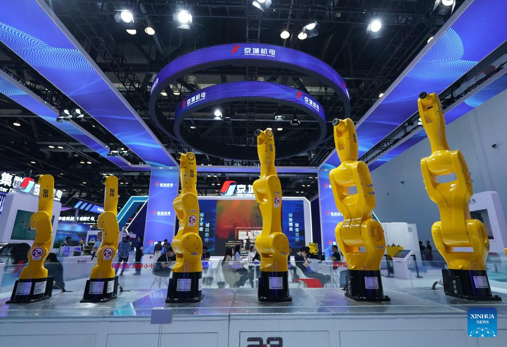 Industrial robots are displayed during the 27th China Beijing International High-tech Expo in Beijing, capital of China, May 8, 2025. The expo opened here on Thursday and will last until May 11. Boasting an exhibition area of about 50,000 square meters, the event has attracted more than 800 exhibitors from home and abroad. (Xinhua/Zhang Chenlin)