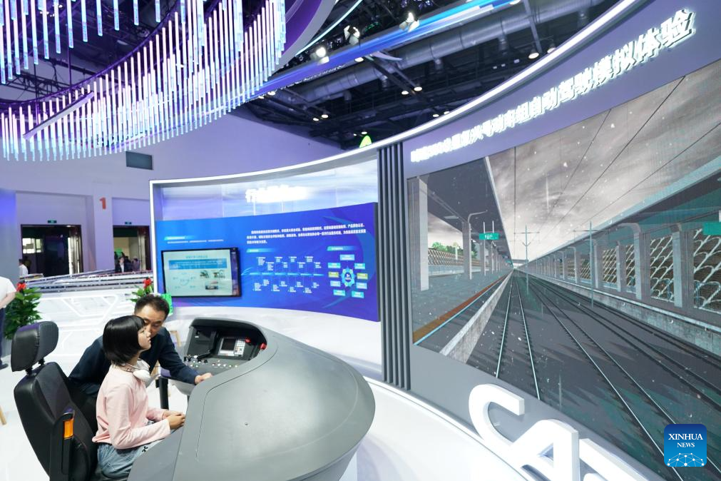 Visitors experience simulated automatic driving of Fuxing bullet train during the 27th China Beijing International High-tech Expo in Beijing, capital of China, May 8, 2025. The expo opened here on Thursday and will last until May 11. Boasting an exhibition area of about 50,000 square meters, the event has attracted more than 800 exhibitors from home and abroad. (Xinhua/Zhang Chenlin)