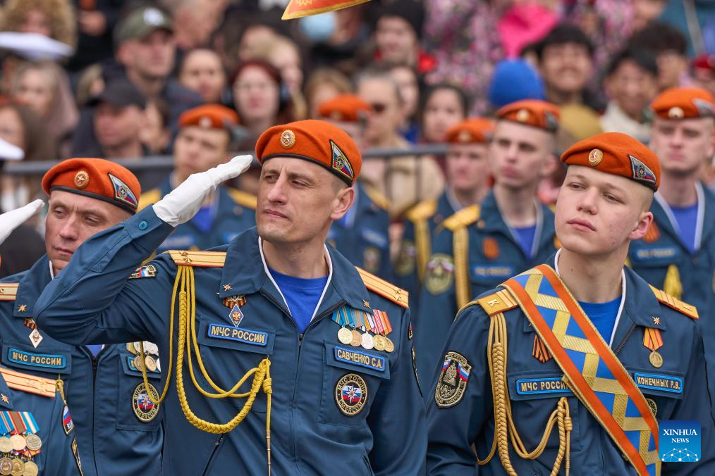 Servicemen marching in formation are pictured during a military parade to commemorate the 80th anniversary of the Victory in the Great Patriotic War in Vladivostok, Russia, May 9, 2025. (Photo by Guo Feizhou/Xinhua)