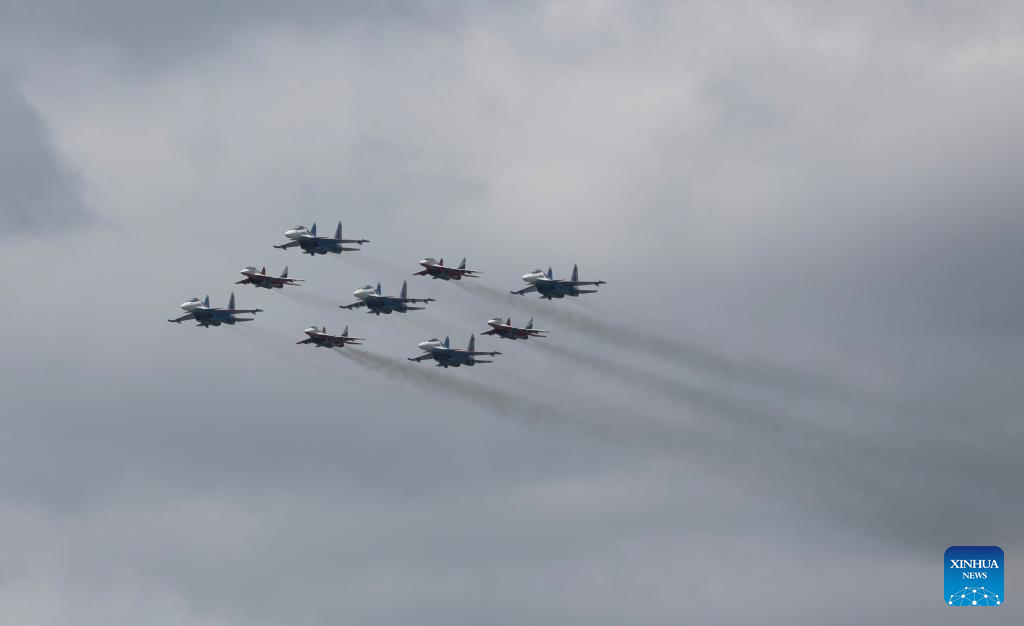 Aircraft fly in formation during a grand parade marking the 80th anniversary of the victory in the Soviet Union's Great Patriotic War in Moscow, Russia, May 9, 2025. (Xinhua/Zhang Ling)