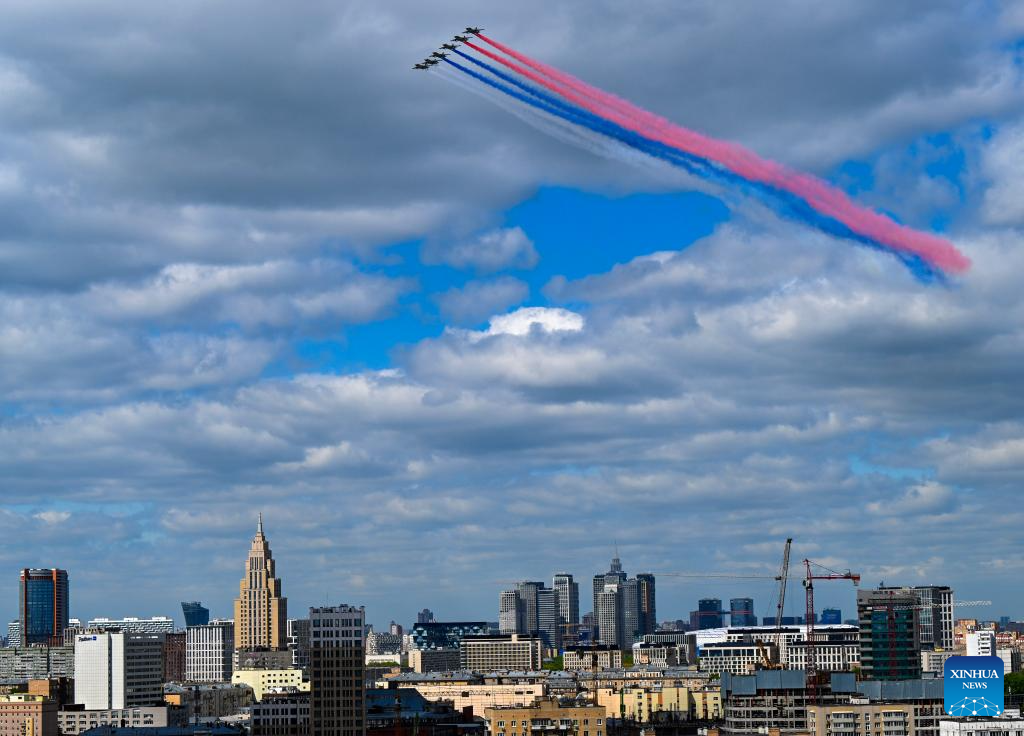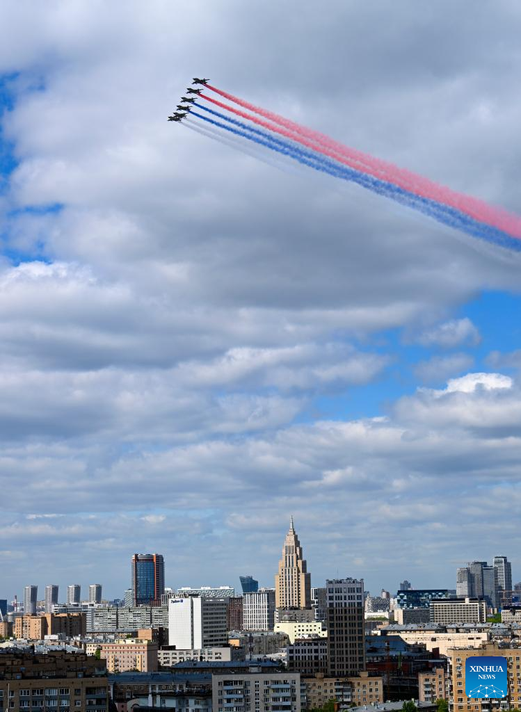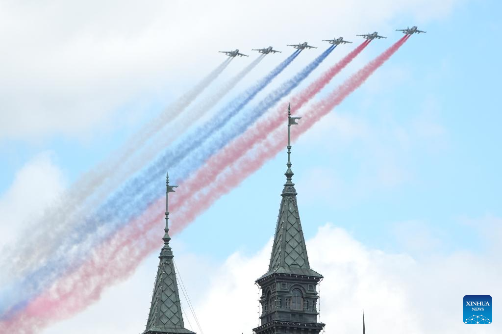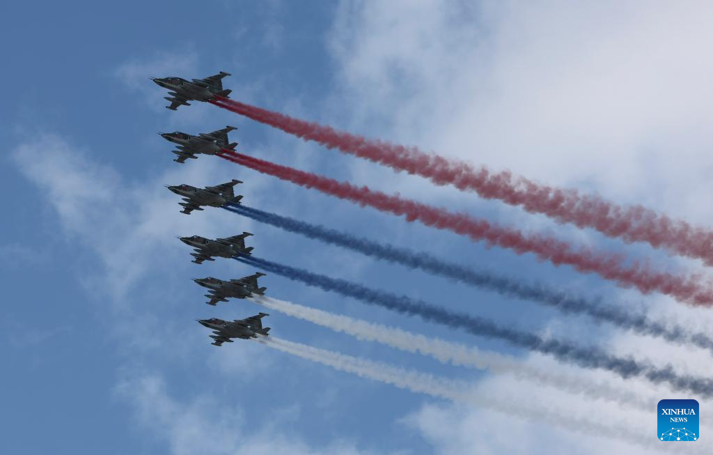 Aircraft fly in formation during a grand parade marking the 80th anniversary of the victory in the Soviet Union's Great Patriotic War in Moscow, Russia, May 9, 2025. (Xinhua/Lai Xiangdong)