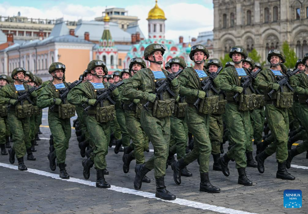 Soldiers march during a grand parade marking the 80th anniversary of the victory in the Soviet Union's Great Patriotic War in Moscow, Russia, May 9, 2025. (Xinhua/Lai Xiangdong)