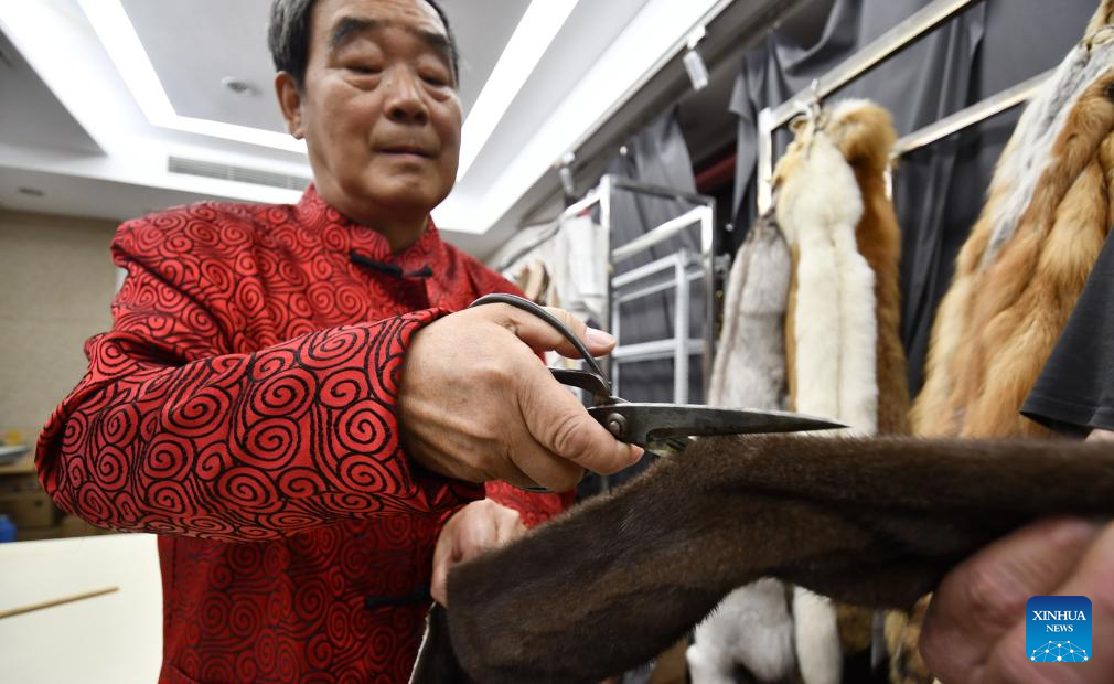 Li Jinshan, an inheritor of Shengxifu hat making technique, cuts a hide in Beijing, capital of China, April 22, 2025.