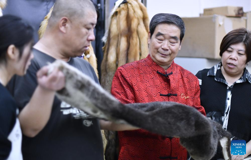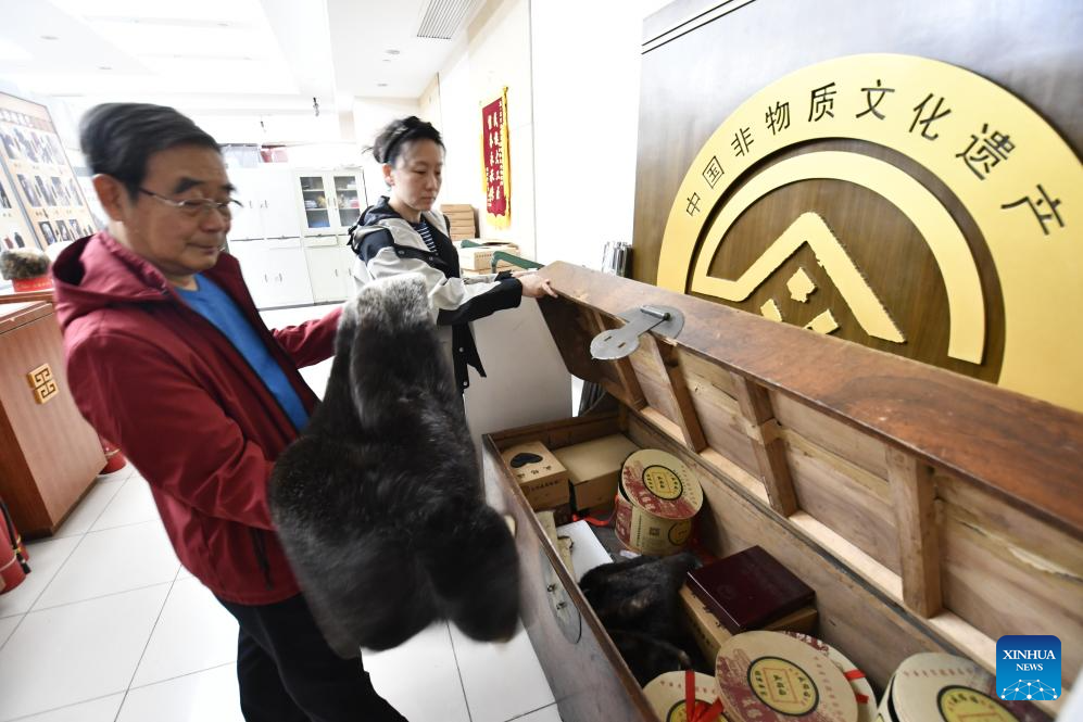 Li Jinshan (L), an inheritor of Shengxifu hat making technique, takes fur from a wooden box in Beijing, capital of China, April 22, 2025.