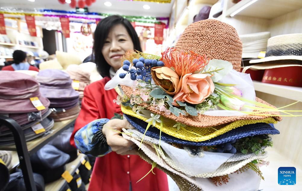 An employee shows hats at a Shengxifu hat store in Beijing, capital of China, April 22, 2025.