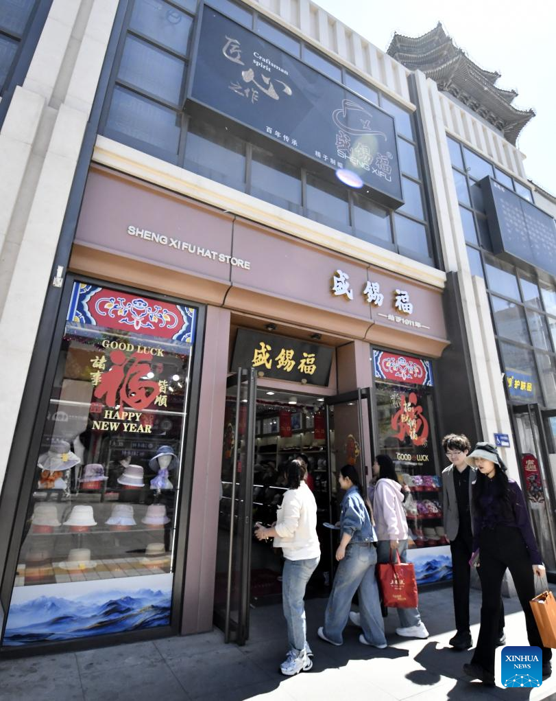 A foreign tourist shops for hats at a Shengxifu hat store in Beijing, capital of China, April 22, 2025.