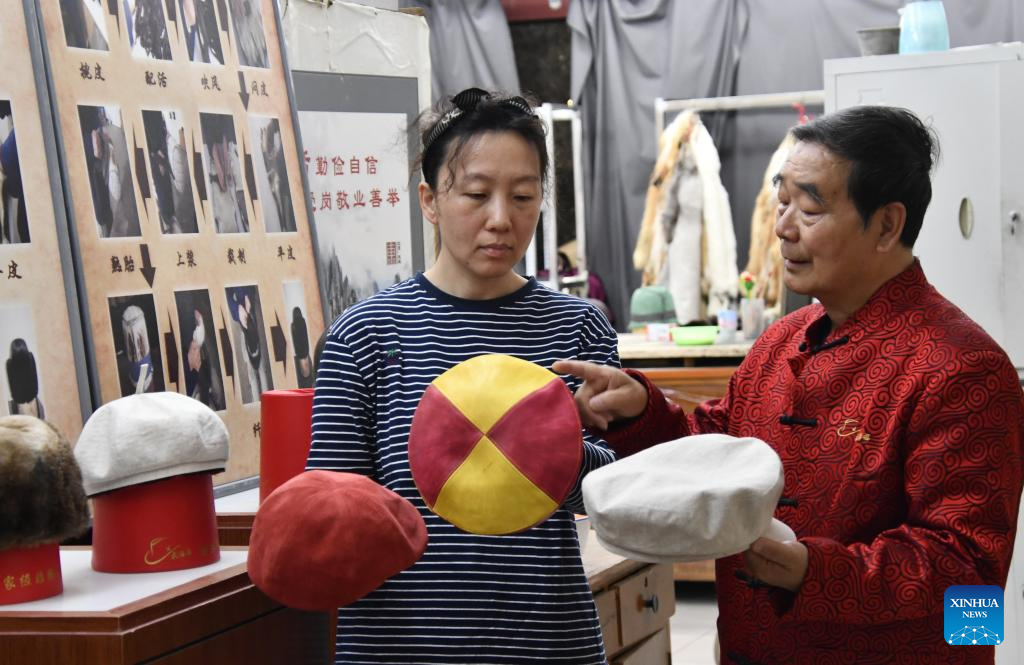 Li Jinshan, an inheritor of Shengxifu hat making technique, checks the quality of a hat in Beijing, capital of China, April 22, 2025.