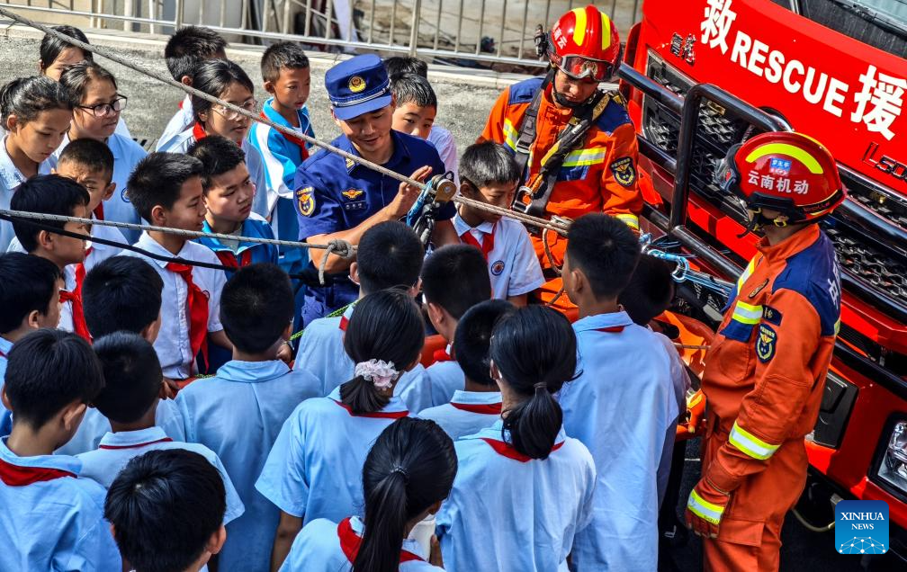 A firefighter introduces the application of pulleys to students in Jinggu County of Pu'er City, southwest China's Yunnan Province, May 9, 2025. China observes the National Disaster Prevention and Reduction Day on May 12 each year. Various publicity, drill and training activities are carried out across China to improve public awareness in scientific disaster prevention and self-rescue. (Photo by Guo Yuanshou/Xinhua)