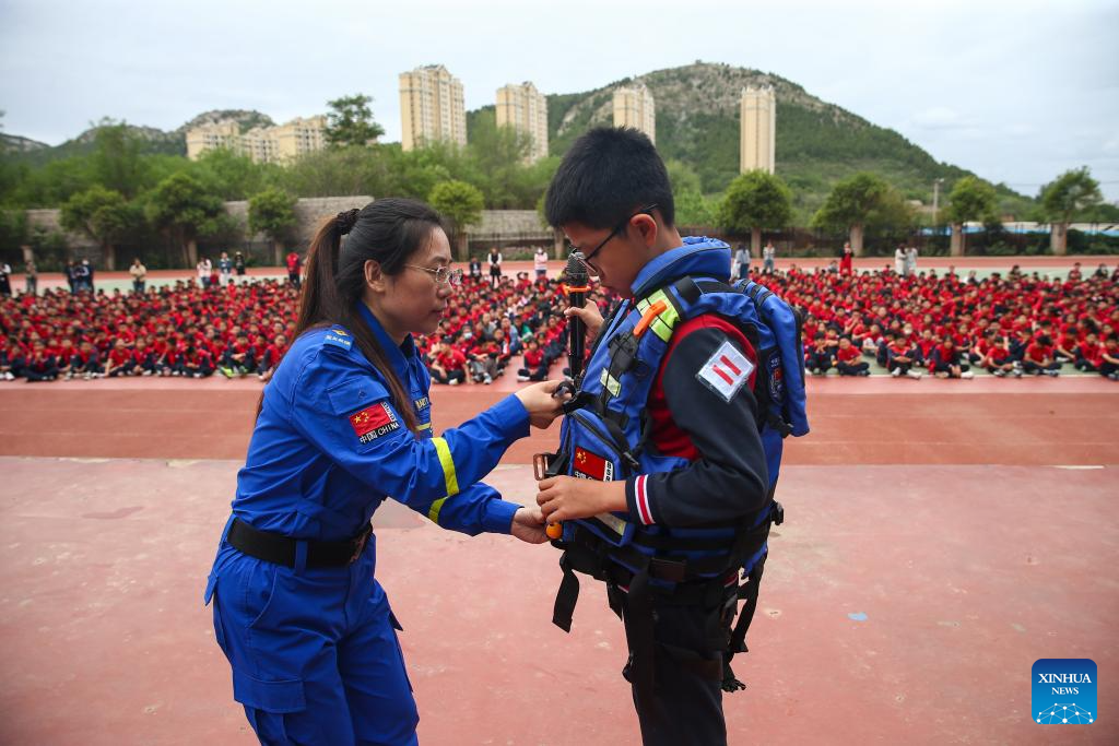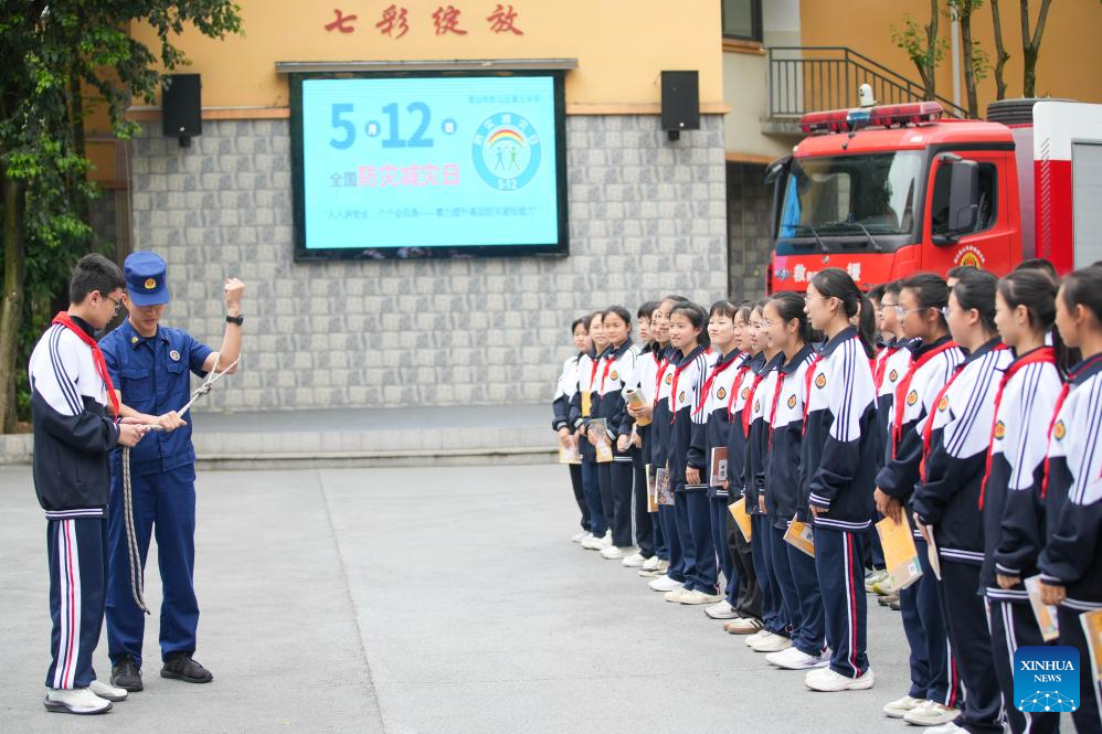 A firefighter introduces the use of escape ropes to students at a middle school in Pengshan District of Meishan City, southwest China's Sichuan Province, May 9, 2025. China observes the National Disaster Prevention and Reduction Day on May 12 each year. Various publicity, drill and training activities are carried out across China to improve public awareness in scientific disaster prevention and self-rescue. (Photo by Weng Guangjian/Xinhua)