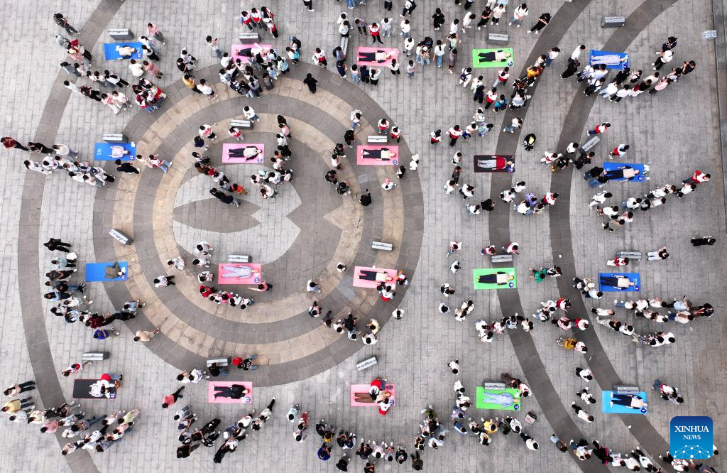 An aerial drone photo taken on May 10, 2025 shows volunteers from University of South China demonstrating cardiopulmonary resuscitation skills to students in Hengyang City, central China's Hunan Province. China observes the National Disaster Prevention and Reduction Day on May 12 each year. Various publicity, drill and training activities are carried out across China to improve public awareness in scientific disaster prevention and self-rescue. (Photo by Cao Zhengping/Xinhua)