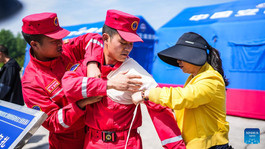 Staff members demonstrate the skills of quick bandaging to citizens during an activity on disaster prevention and reduction held in Guiyang, southwest China's Guizhou Province, May 11, 2025. China observes the National Disaster Prevention and Reduction Day on May 12 each year. Various publicity, drill and training activities are carried out across China to improve public awareness in scientific disaster prevention and self-rescue. (Xinhua/Tao Liang)