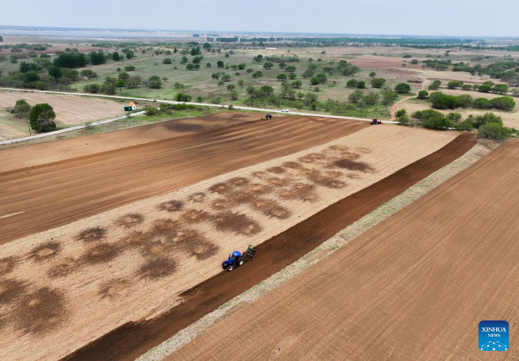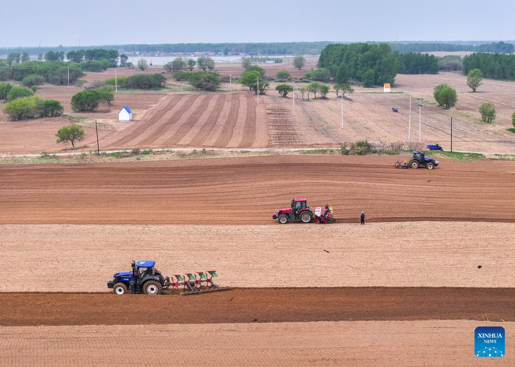 An aerial drone photo taken on May 9, 2025 shows farmers operating tractors equipped with Beidou navigation system for plowing in Horqin Left Wing Rear Banner of Tongliao City, north China's Inner Mongolia Autonomous Region. (Xinhua/Lian Zhen)