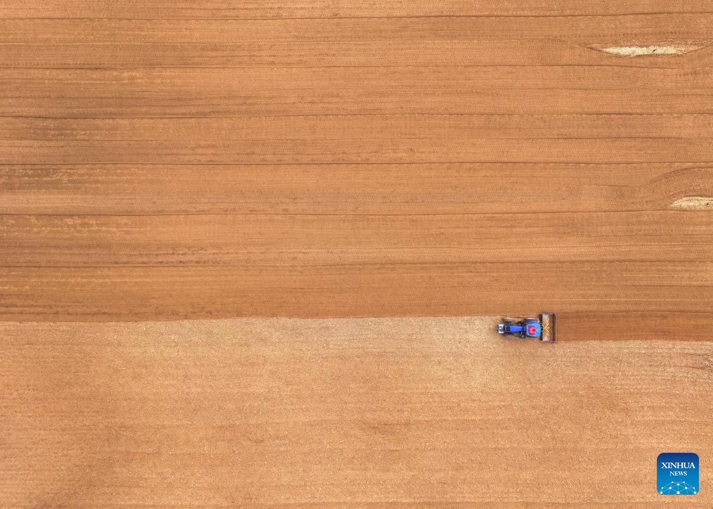 An aerial drone photo taken on May 9, 2025 shows a farmer operating a tractor equipped with Beidou navigation system for plowing in Horqin Left Wing Rear Banner of Tongliao City, north China's Inner Mongolia Autonomous Region. (Xinhua/Lian Zhen)