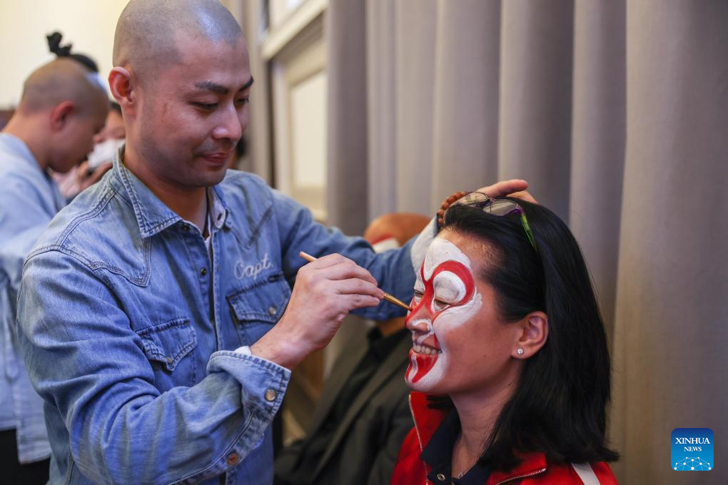 A lady experiences the art of Peking Opera during a Peking Opera salon in Auckland, New Zealand, May 10, 2025. The 2025 "Knowing Hubei, Echoes of Peking Opera Around the World" Peking Opera Gala was staged at the Civic Theater in New Zealand's largest city Auckland on Friday evening, receiving an enthusiastic response from local audiences.